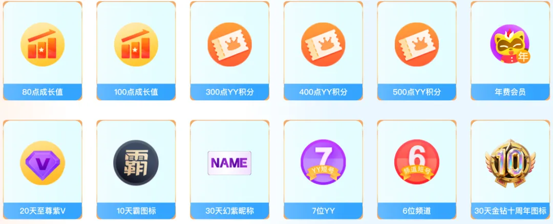 最多可领取成长值共15次、其他奖品共15次、6位YY短号奖品1次、频道短号定制券1次。