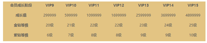 注:同时满足对应成长值、金钻等级、紫钻等级要求可升级至VIP9-VIP15,不满足任一条件时,则会立刻失去对应等级身份,具体要求如下: