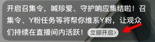 ①娱乐主播在直播间点击“更多”--》进入“互动中心”--》点击“Y粉召集令”--》选择开启模式--》点击“开启”即可。