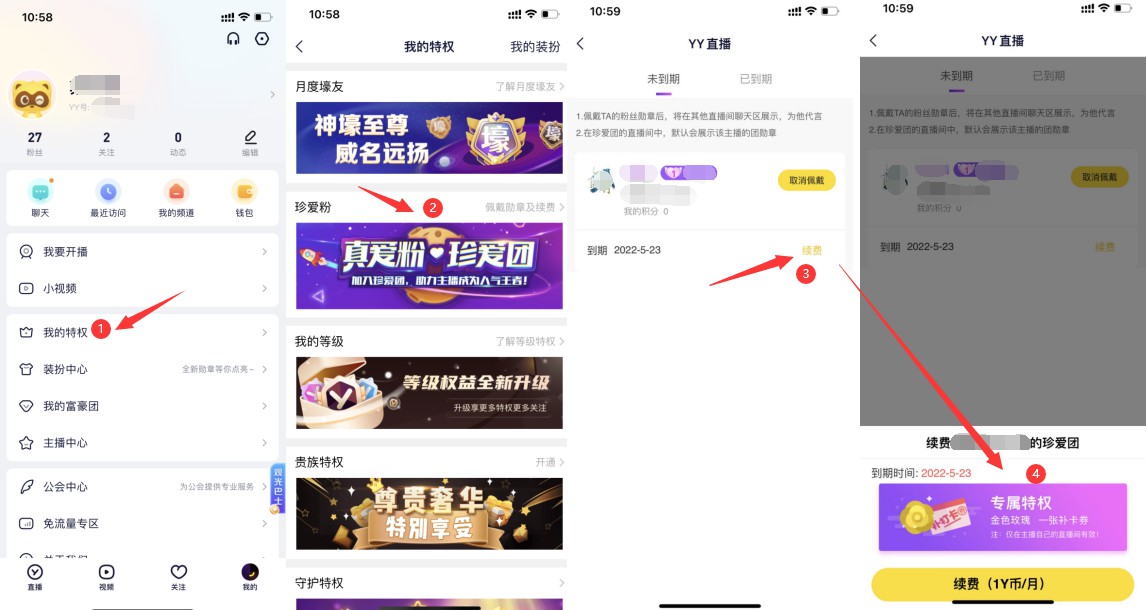 如何给YY娱乐 Y粉团 珍爱粉 进行续费