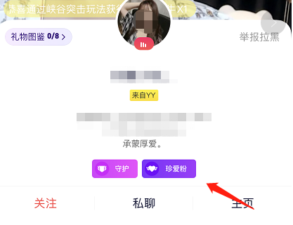3、在百度联运APP/手机YY娱乐直播间--》点击“主播头像”--》点击“珍爱粉”--》即可根据页面提示进行续费。