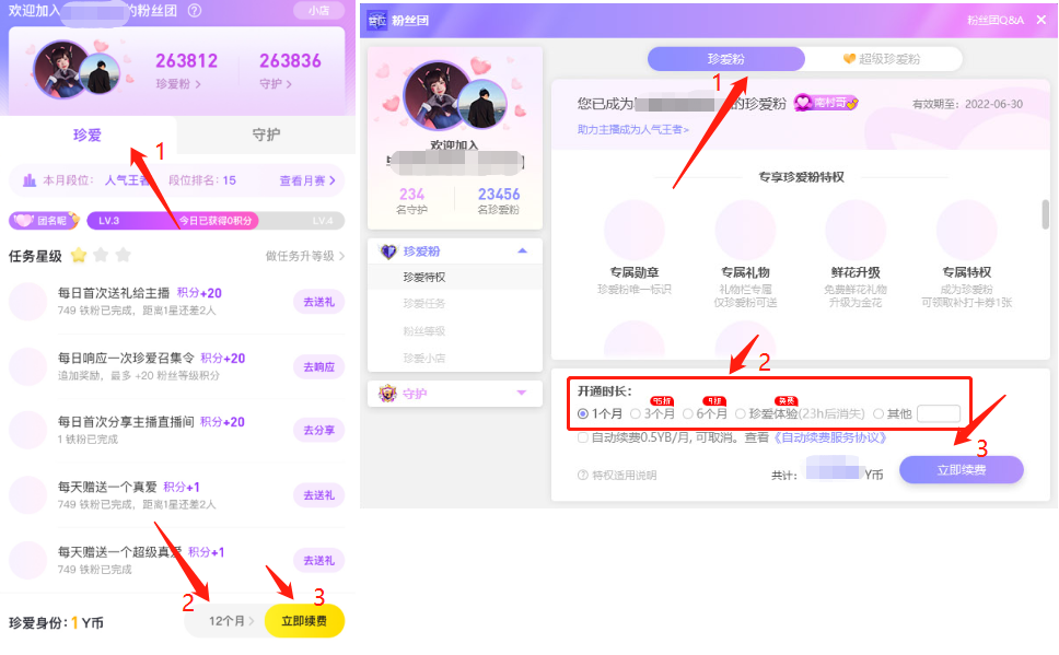 1、在手机YY或PCYY客户端进入Y粉团规则界面--》点击“珍爱粉”--》选择“珍爱粉”续费时长--》点击“立即续费”,支付即可。