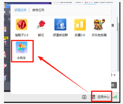 2、PCYY客户端:主播在PCYY客户端娱乐直播间开播后--》点击右下角“应用中心”--》在【频道应用】会显示“小风车”功能的入口。