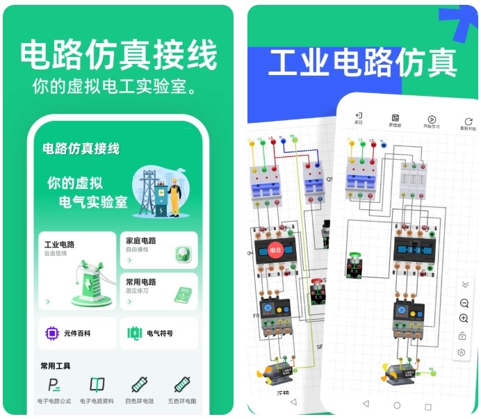 支持多种类型的电路连接设计,适用于从零基础到进阶阶段的电工学习人群,是掌上必备的电工模拟器与电路模拟工具。