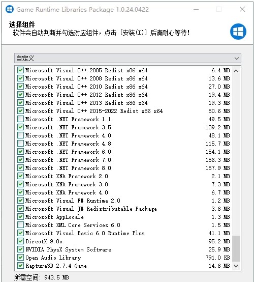游戏常用运行库 合集 整合了许多游戏会用到的运行库,支持 Windows XP – Windows 11 系统,并且支持自动检测系统勾选推荐的运行库,方便快捷。