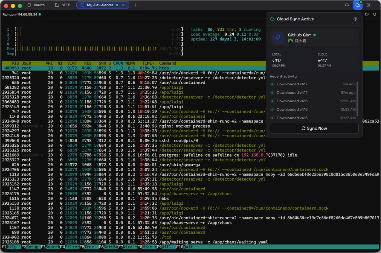 分屏终端、Vault 多视图、SFTP 工作流、自定义主题、关键词高亮一应俱全。