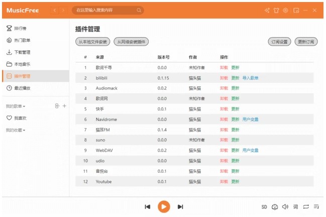 插件支持的功能:搜索(音乐、专辑、作者、歌单)、播放、查看专辑、查看作者详细信息、导入单曲、导入歌单、获取歌词等。