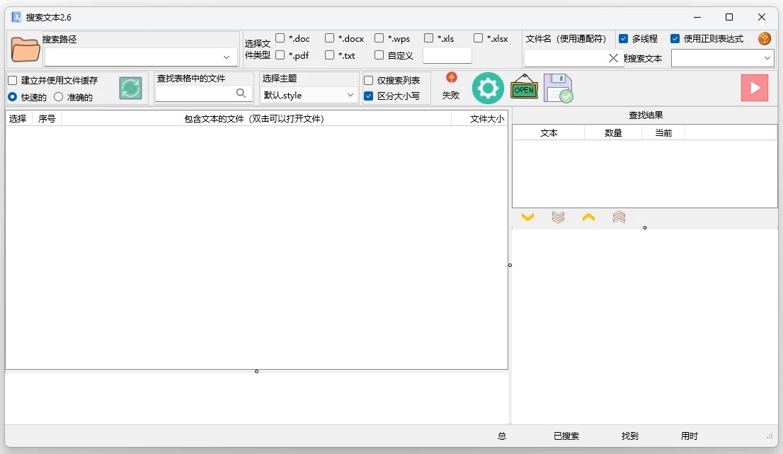 搜索文本是一款从word、wps、excel、pdf和txt文件中查找文本的工具,可以批量从doc、docx、wps、xls、xlsx、pdf和txt文件中查找关键文本,支持一次查找多个关键字(关键字之间是或者的关系),用逗号分隔,支持正则表达式,也可以在已有列表中查找。